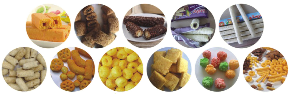 該設備從原料配制、擠壓膨化、夾芯、成型、切斷、噴涂、調料到出成品一次完成,自動化程度很高。該生產線具有機型多、配置靈活、原料范圍廣、產品種類多、操作簡單等特點,選擇合適的配置可生產夾芯餅、夾芯管、膨化米果、麥燒、鍋巴、營養早餐、玉米片等產品。經膨化后的食品具有口感酥脆、易消化、香味獨特、攜帶方便,是消費者理想的休閑食品。